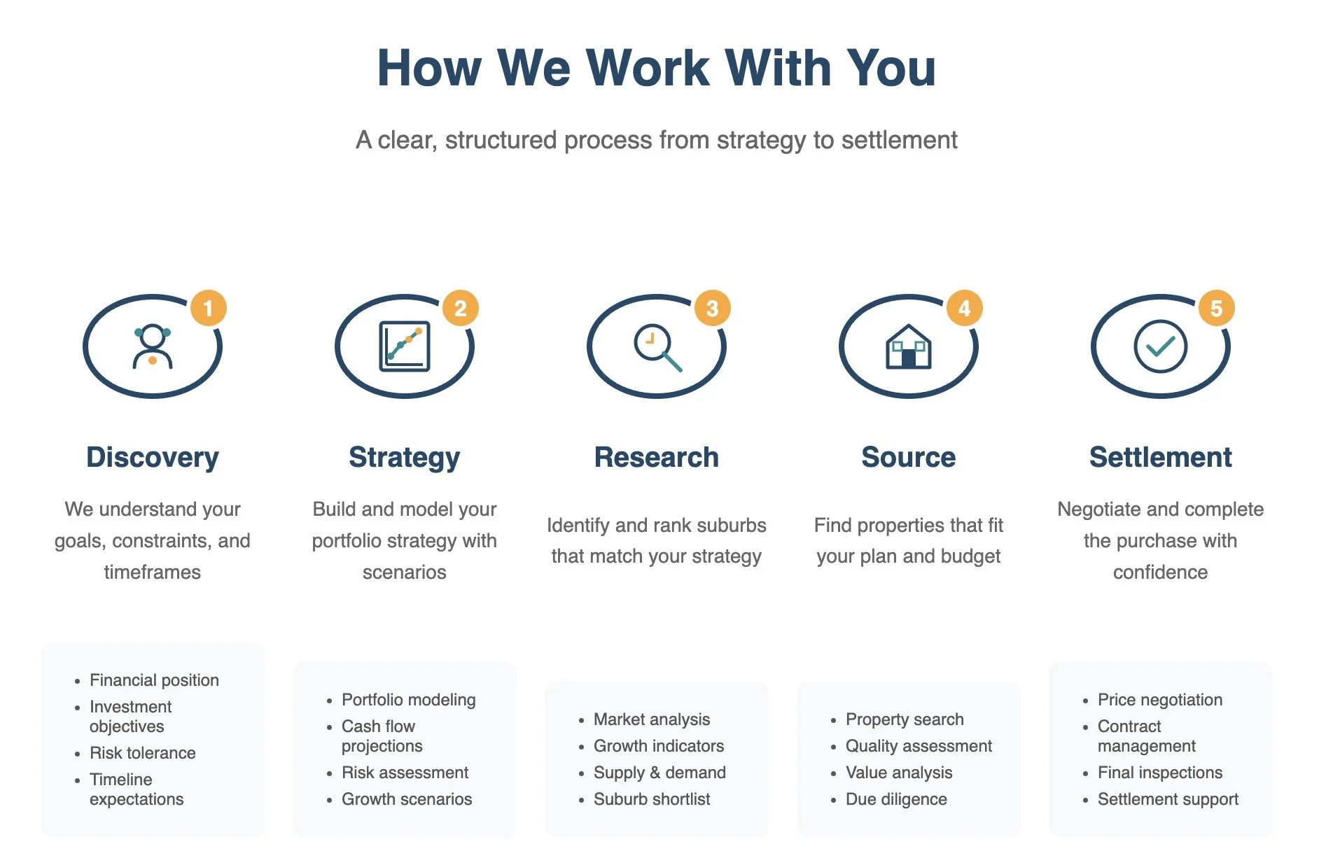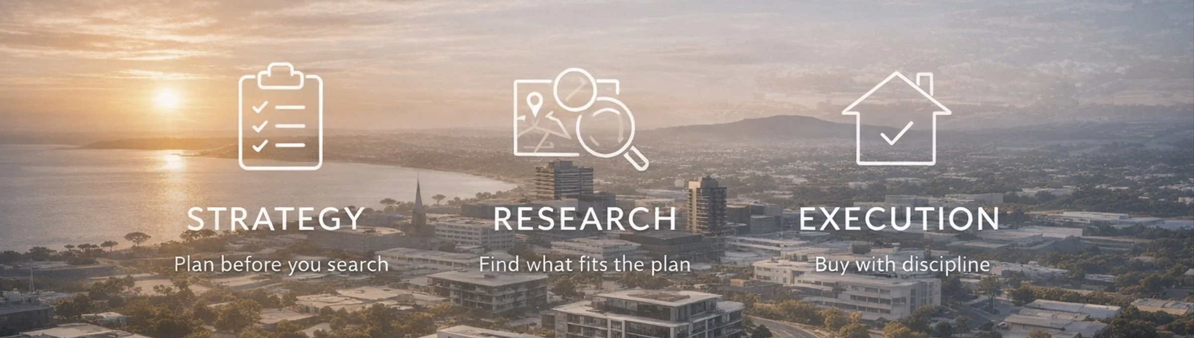 That's why we sequence strategy first, followed by execution. We help you build a clear plan first—defining what you're trying to achieve, what constraints you're working within, and what your next property actually needs to deliver. Only then do we move to sourcing and acquisition.